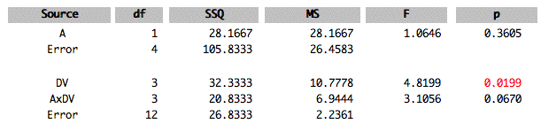 effect of the within-subjects factor. A x DV is the interaction of the between-subjects