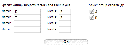 two independent variable (A and B) and four dependent variables (D1T1, D1T2,