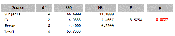 - The Summary Table is presented. The effect "DV" stands for "Dependent Variable."
