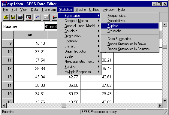 go to the "Statistics" option on the menu bar and select "Summarize" and then "Explore":