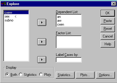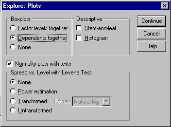 Also notice that for box plots the option "Dependents together" is chosen. This produces the side by side boxplot instead of a separate boxplot for each variable.