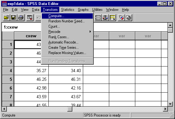 It should now show the data set with the proper column titles. You might notice that the numeric fields only have the numbers reported to 2 decimal places. If you click on a cell, however, you will see that the full number has been retained and only the first 2 decimal places are seen. If this bothers you, you can change it by first selecting a variable in the editor and then choose "Define Variable..." under the "Data" menu. Then click the "Type" button on the window and change the "Decimal Places" to however many you need.