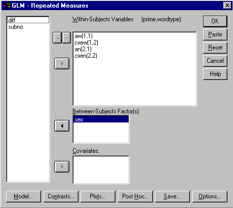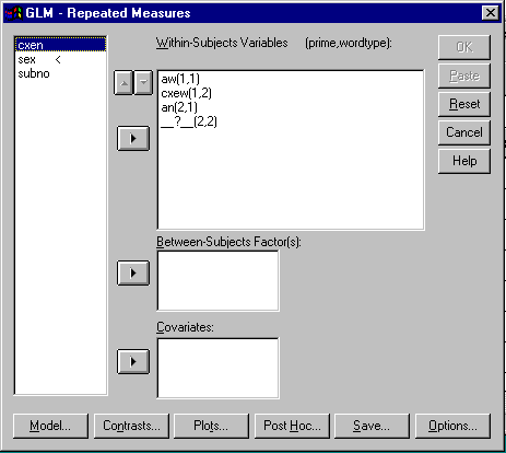 how the box under "Within-Subjects Variables (prime,wordtype):"