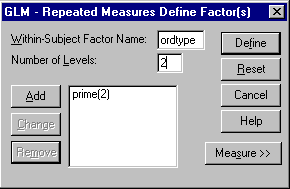 Be sure to choose the "GLM - Repeated Measures..." option since we are dealing with a within subjects design. When the "Define Factors" window pops up, go to the box "Within-Subject Factor Name:" and type the first main effect: "prime". The number of levels for this factor is 2. Then click the "Add" button. the Factor "prime(2)" should appear in the lower box. (see below)