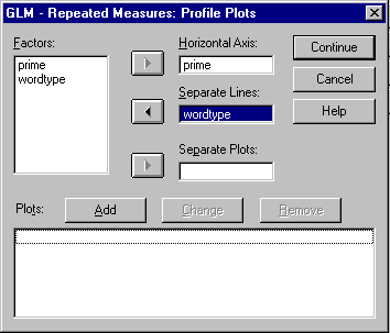 Once both are filled, click the "Add" button and "prime*wordtype" should appear in the lower box. Since we have no other plots, click the "Continue" button. Then go back to the previous window - "GLM - Repeated Measures" and click "OK".