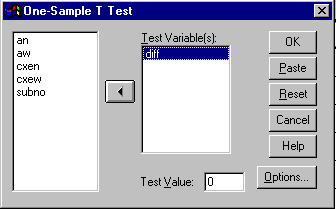 SIDE NOTE - If we arrange the data differently, this could also be done with the "Paired-Samples T Test" option. Instead of the one new difference score, we make two new variables, one for the weapon prime condition aggression accessibility score "(cxew-aw)" and one for the nonweapon prime condition aggression accessibility score"(cxen-an)", in the same way we created the variable "diff". Then we select the "Paired-Samples T Test" option and select the two new variables.