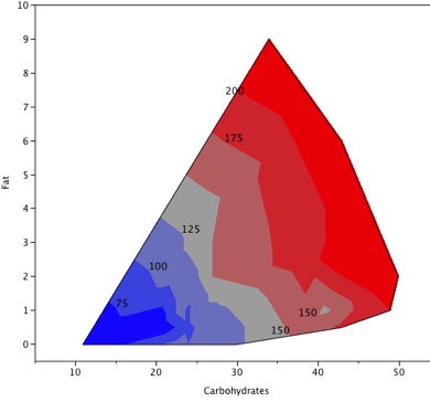 Figure 1. A contour plot showing calories as a function of fat and carbohydrates.