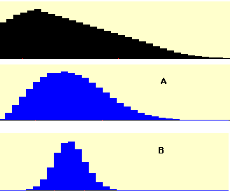 22. True/false: Refer to the figure below. The population distribution is shown in black, and its corresponding sampling distribution of the mean for N = 10 is labeled "A." (relevant section & relevant section)