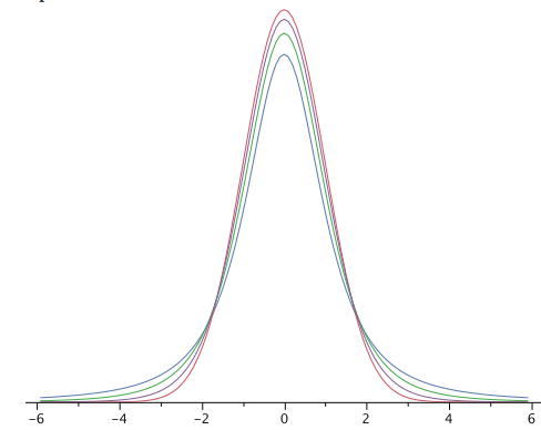 Figure 1. A comparison of t distributions with 2, 4, and 10 df and the standard normal distribution. The distribution with the lowest peak is the 2 df distribution, the next lowest is 4 df, the lowest after that is 10 df, and the highest is the standard normal distribution.