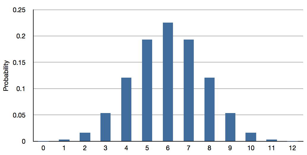 More technically, the best prediction for the subject's result on the retest is the mean of the binomial distribution with N = 12 and p = 0.50. This distribution is shown in Figure 2 and has a mean of 6.