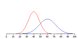 of 5; the blue distribution has a mean of 60 and a standard deviation of 10.