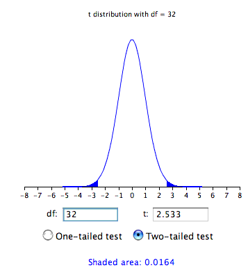 t = 2.5335, df = 32, p-value = 0.01639