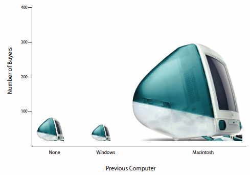 Here is another way that fanciness can lead to trouble. Instead of plain bars, it is tempting to substitute meaningful images. For example, Figure 5 presents the iMac data using pictures of computers. The heights of the pictures accurately represent the number of buyers, yet Figure 5 is misleading because the viewer's attention will be captured by areas. The areas can exaggerate the size differences between the groups. In terms of percentages, the ratio of previous Macintosh owners to previous Windows owners is about 6 to 1. But the ratio of the two areas in Figure 5 is about 35 to 1. A biased person wishing to hide the fact that many Windows owners purchased iMacs would be tempted to use Figure 5 instead of Figure 2! Edward Tufte coined the term "lie factor" to refer to the ratio of the size of the effect shown in a graph to the size of the effect shown in the data. He suggests that lie factors greater than 1.05 or less than 0.95 produce unacceptable distortion.