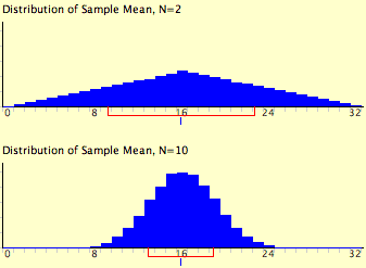The expressions for the mean and variance of the sampling distribution of the mean are not new or remarkable. What is remarkable is that regardless of the shape of the parent population, the sampling distribution of the mean approaches a normal distribution as N increases. If you have used the "Central Limit Theorem Demo," you have already seen this for yourself. As a reminder, Figure 1 shows the results of the simulation for N = 2 and N = 10. The parent population was a uniform distribution. You can see that the distribution for N = 2 is far from a normal distribution. Nonetheless, it does show that the scores are denser in the middle than in the tails. For N = 10 the distribution is quite close to a normal distribution. Notice that the means of the two distributions are the same, but that the spread of the distribution for N = 10 is smaller.