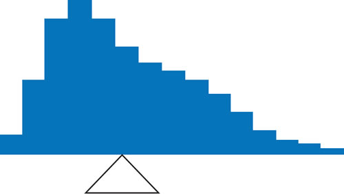 Figure 5 shows an asymmetric distribution. To balance it, we cannot put the fulcrum halfway between the lowest and highest values (as we did in Figure 3). Placing the fulcrum at the "half way" point would cause it to tip towards the left.
