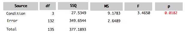 shows the ANOVA summary table for the "Smiles and Leniency" data.