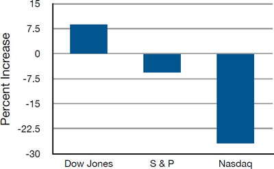 in the Dow Jones, Standard and Poor 500 (S & P), and Nasdaq