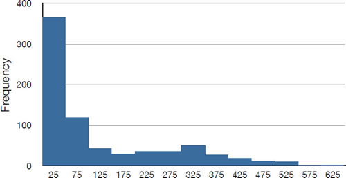 Figure 1. A distribution with a very large positive skew. This histogram shows the salaries of major league baseball players (in tens of thousands of dollars).