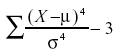 The following measure of kurtosis is similar to the definition of skew. The value "3" is subtracted to define "no kurtosis" as the kurtosis of a normal distribution. Otherwise, a normal distribution would have a kurtosis of 3.